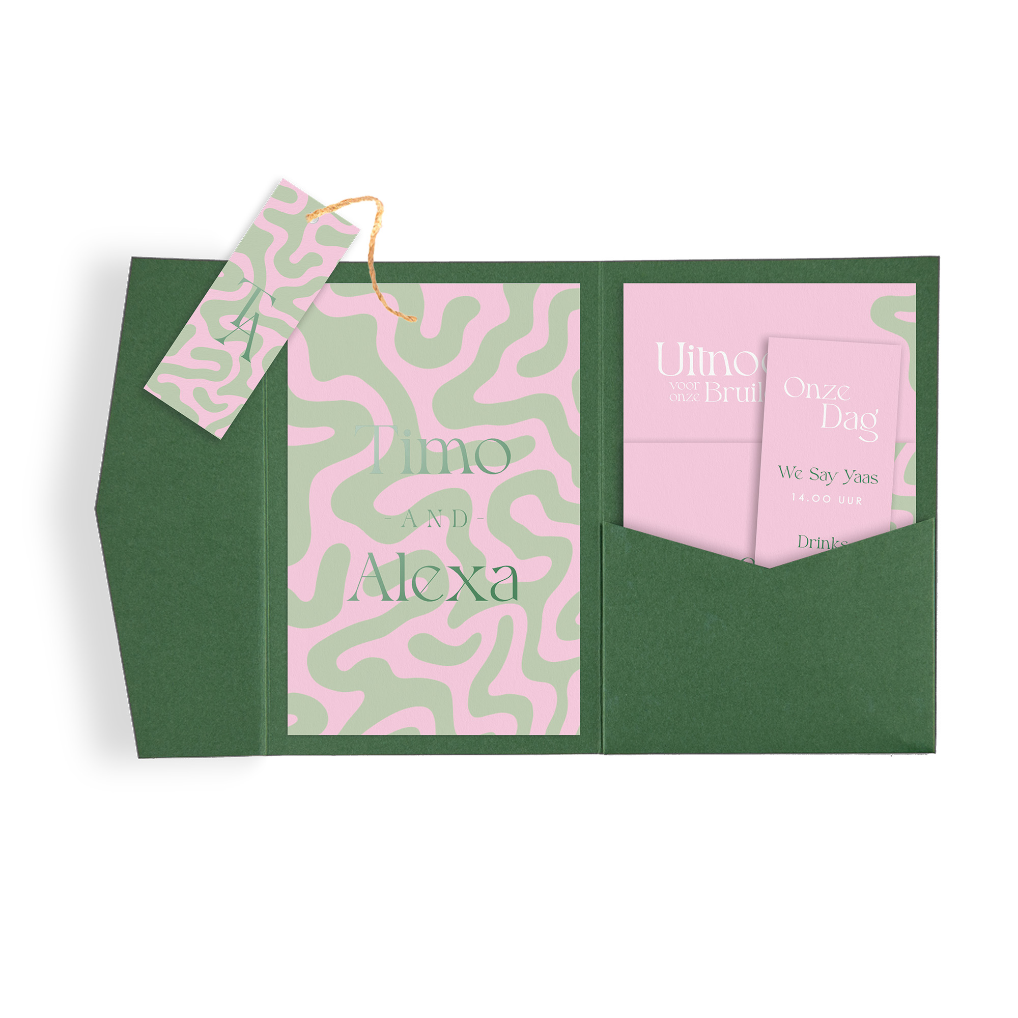 Pocketfold trouwkaart roze met groene vormen en hoogglans