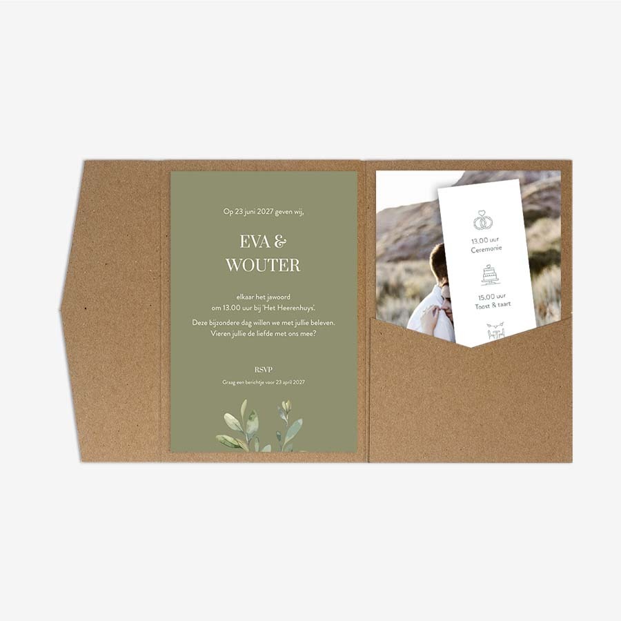 Stijlvolle pocketfold trouwkaart in groen en wit met een eucalyptustakje in watercolour. Op het kleine kaartje een handig overzicht van het dagprogramma van jullie trouwdag, met leuke icoontjes erbij.