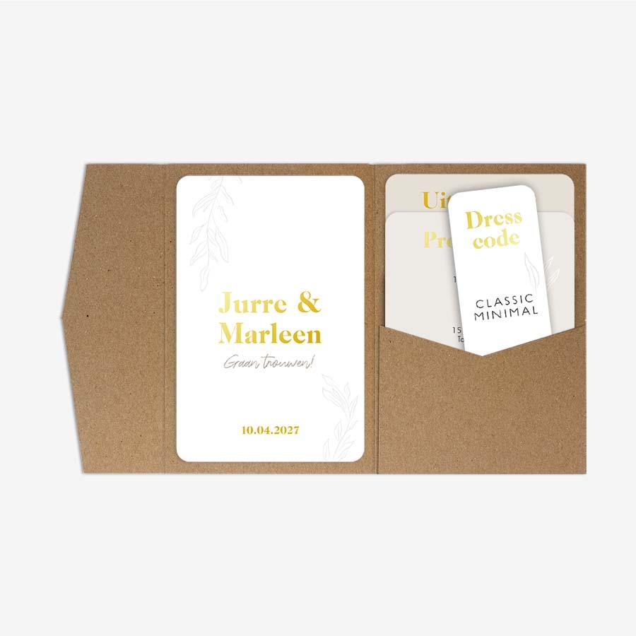Stijlvolle trouwkaart in zachte pastelkleuren en wit met een design van subtiel getekende takjes. De tekst is voor een deel in goudfolie voor een extra luxe effect. Op de afzonderlijke kaartjes is plaats voor bijvoorbeeld het dagprogramma, dresscode en je kunt een mooie eigen foto toevoegen.