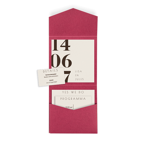 Moderne trouwkaarten-set voor pocketfold met datum op beige achtergrond. Algemene informatie