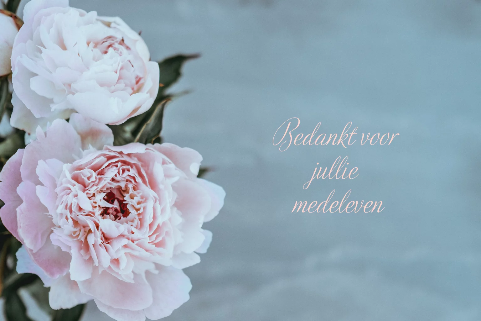Stijlvolle rouw bedankkaart met lichtroze rozen op een lichtblauwe achtergrond. Aan de binnenkant van de kaart kun je een eigen foto toevoegen. Pas de teksten naar wens aan in de online editor.