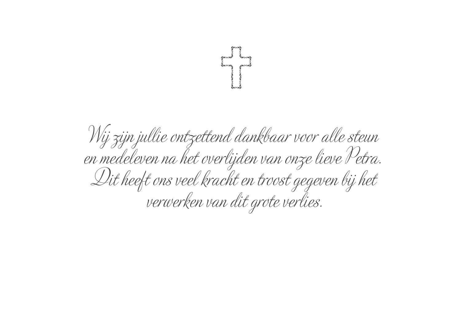 Stijlvolle rouw bedankkaart met foto van bloemen in roze en paarse kleuren in de hoeken. Aan de binnenzijde is ruimte om een mooie foto toe te voegen en een persoonlijke tekst te maken. In de online editor pas je deze kaart naar eigen wens aan.
