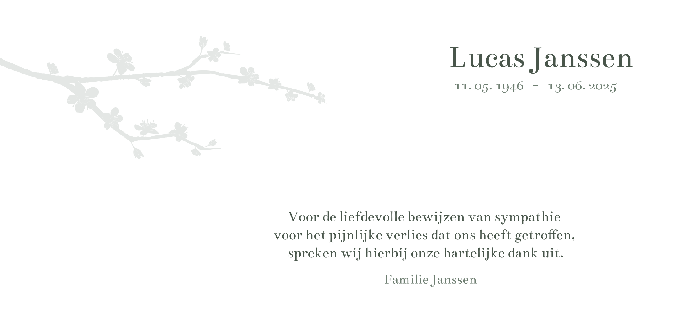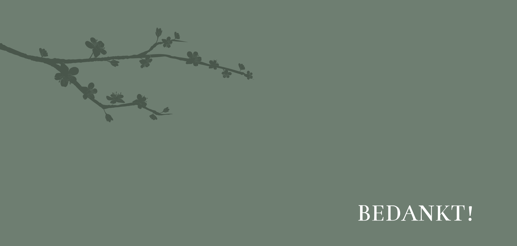Mooie bedankkaart voor rouw. Deze kaart heeft een rustig ontwerp met het silhouet van een donkergroene tak met bloemetjes op een olijfgroene achtergrond.