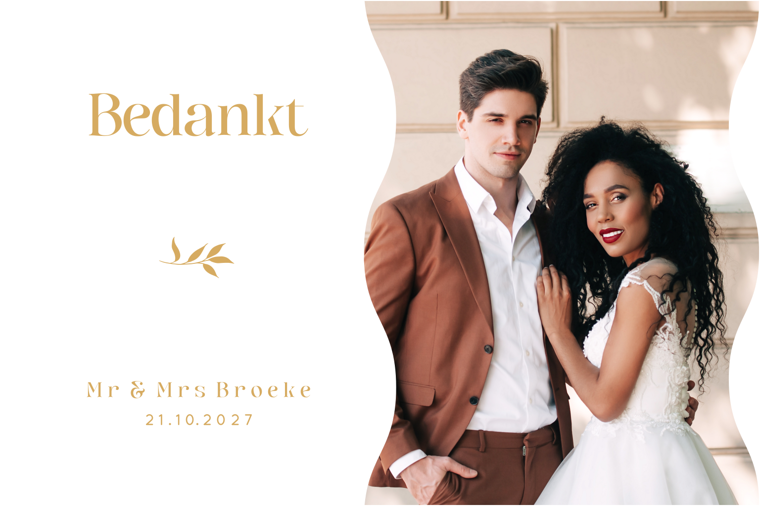 Chique bedankkaart met tekst in goudfolie aan beide zijden. Op de voorkant is ruimte om een eigen foto toe te voegen, de kaart is aan 1 kant met een gegolfde rand in de stijl van de trouwkaart. Mooi persoonlijk bedankje voor jullie bruiloftsgasten!