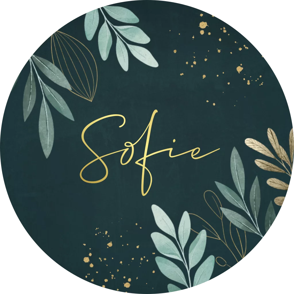 Een origineel geboortekaartje in ronde vorm met goudfolie tekst. Het geboortekaartje heeft een donkergroene achtergrond met daarop prachtige olijfbladeren. De naam van jullie dochtertje wordt in goudfolie gedrukt.