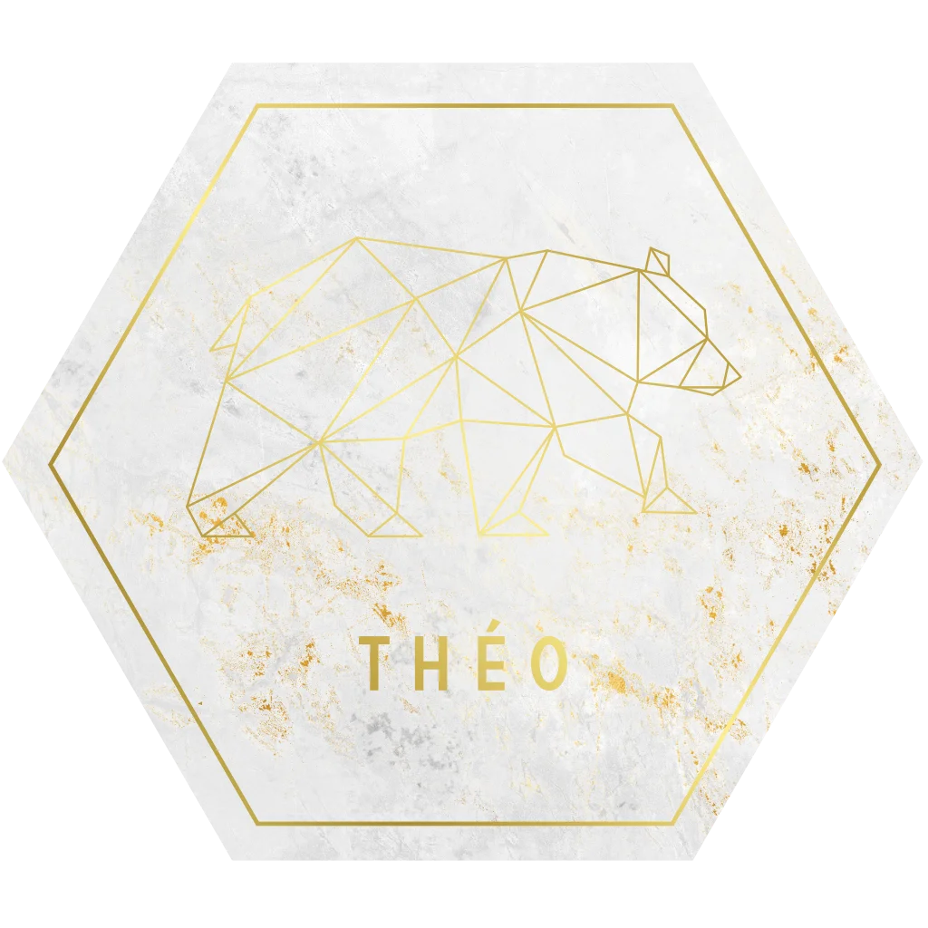 Dit stoere geboortekaartje voor een jongen is in de vorm van een zeshoek. Op de marmerlook achtergrond is een beer getekend in goudkleurige geometrische lijnen en ook langs de rand staan goudkleurige lijnen. Een origineel geboortekaartje voor jullie kleine man!