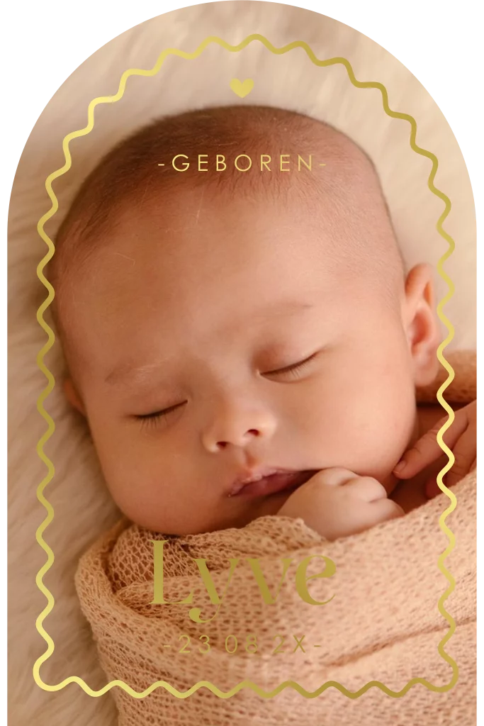 Een luxe unisex geboortekaart in boogvorm, met het kader, het hartje en de naam in goudfolie gedrukt. Gebruik de mooiste foto van jullie kindje, en pas zo het kaartje helemaal naar eigen wens aan in de online editor.