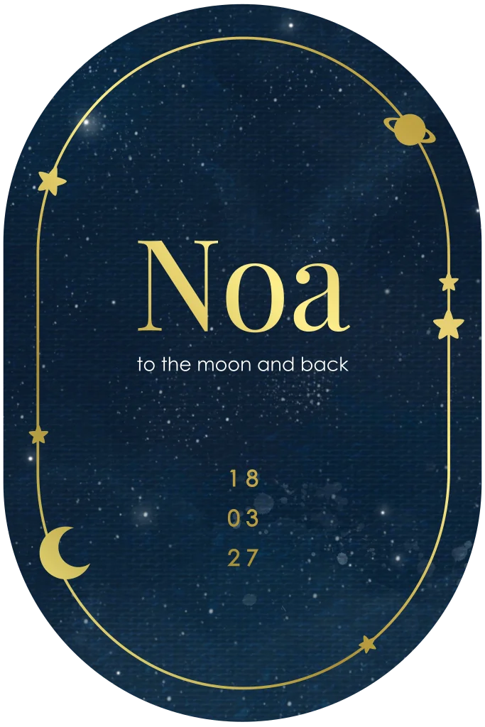Naar de maan en terug, zoveel houden jullie van jullie kindje! Daar past dit ovale donkerblauwe kaartje met een nachtlucht perfect bij! De naam, maan en sterren staan in goudfolie, een mooi contrast met de donkere achtergrond.