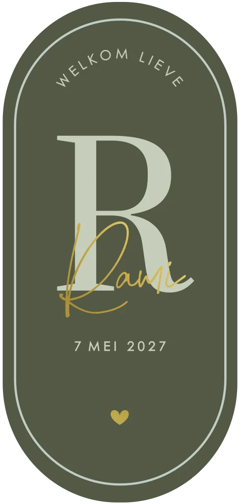 Hip geboortekaartje in langwerpige ovale vorm. Op de groene achtergrond staat de naam van de kleine in sierlijk handschrift van goudfolie over een initiaal in lichtgroen.