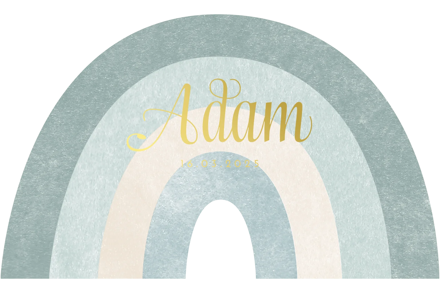 Hip geboortekaartje in de vorm van een regenboog in verschillende kleuren blauw. De naam staat in luxe goudfolie en staat in het midden van de regenboog.