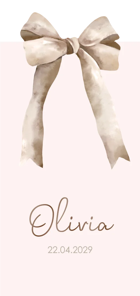 Klassiek geboortekaartje met sierlijke roze strik op de kaart gedrukt.