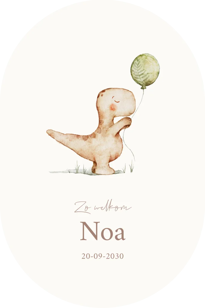 Schattig geboortekaartje in ovale vorm met een baby dino met groene ballon. Verander de naam op het kaartje in de editor en maak het geboortekaartje compleet naar je eigen wensen.