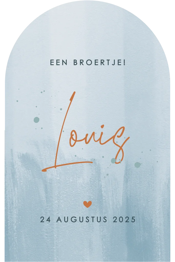 Een geboortekaartje met een unieke boogvorm. Het kaartje is verder afgewerkt met een blauwe waterverf achtergrond en typografie en een hartje.