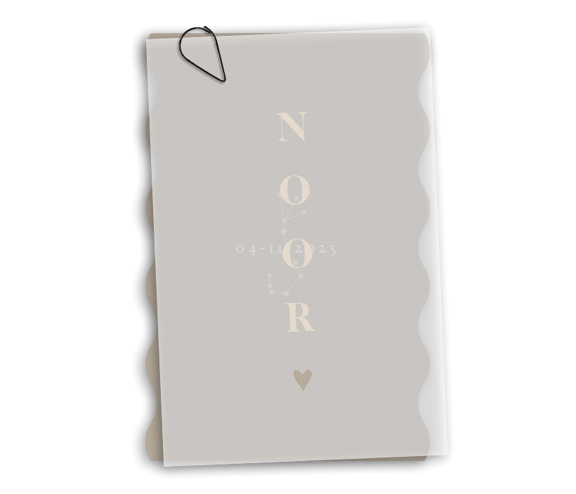Bestel bij deze kaart het voorblad met de babynaam. Dit voorblad is gemaakt van transparant papier.