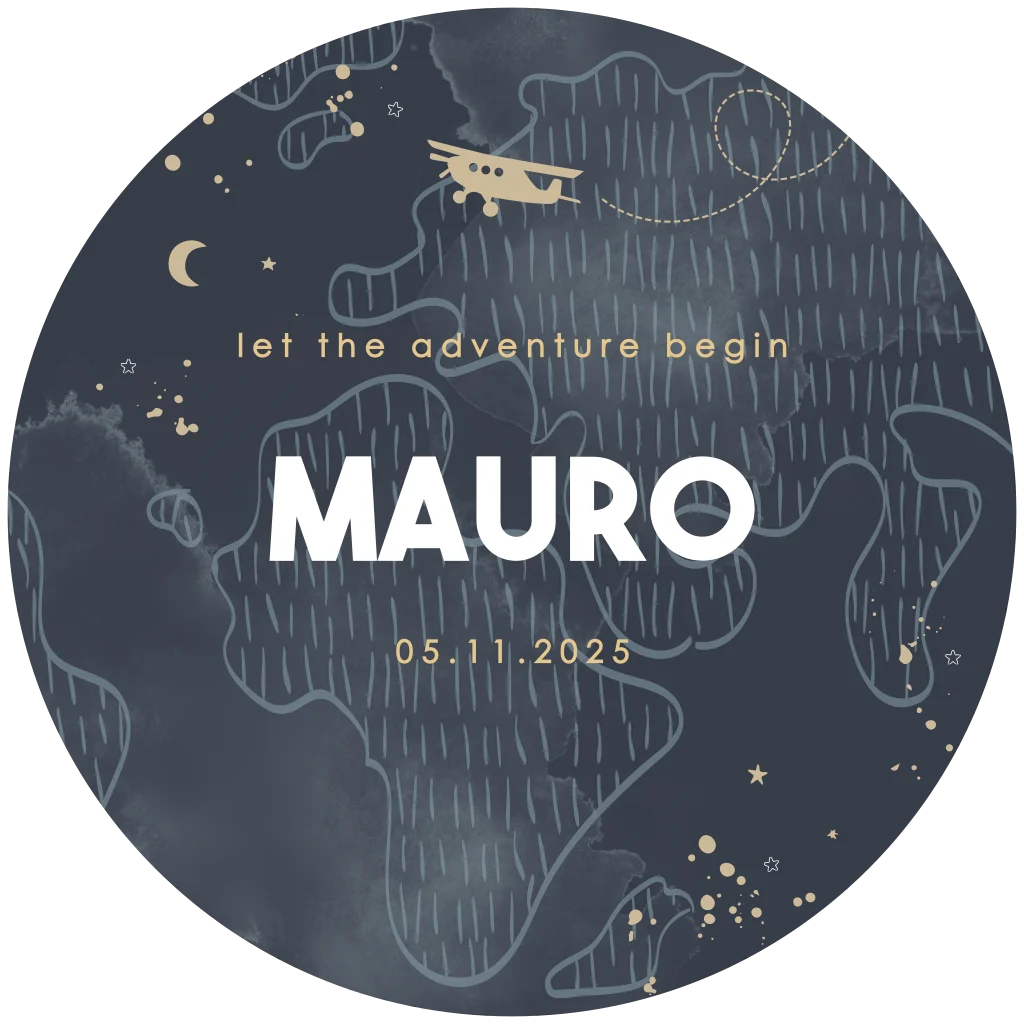 Een origineel donkerblauw geboortekaartje in een ronde vorm. Op het kaartje staat een wereldkaart en een vliegtuigje.| Totaalprijs: 0 |