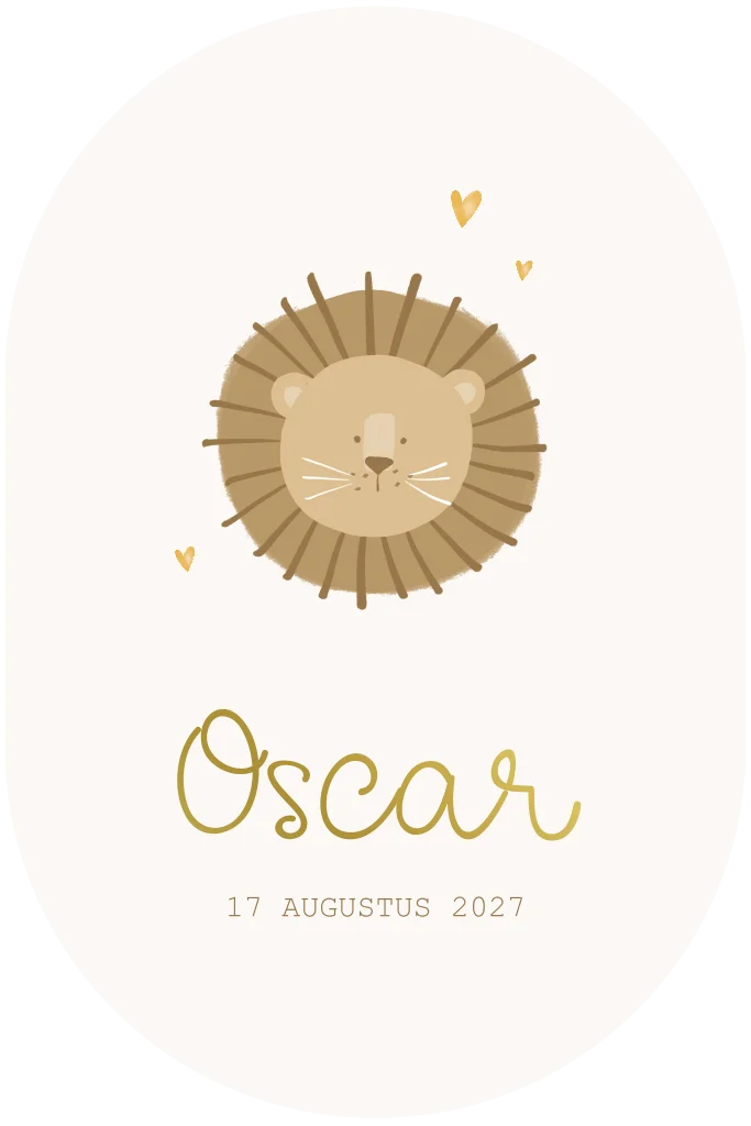 Bij de geboorte van jullie kleintje, hoort een speciaal geboortekaartje. Wat dacht je van dit ovale kaartje met leeuwtje? De naam op de voorkant staat in goudfolie druk, voor een extra feestelijk tintje!