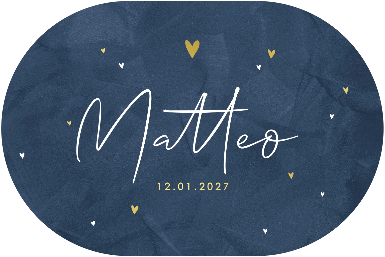 Ovaal geboortekaartje met donkerblauwe waterverf achtergrond en goud met witte hartjes. De naam staat in sierlijke witte typografie, pas de tekst naar wens aan in de online editor.