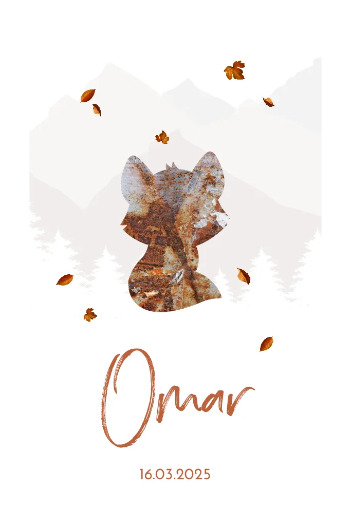 Origineel geboortjekaartje, staand model met twee afgesneden hoekjes. Wit kaartje met aquarel achtergrond van bergen en bomen met daarop een bruin vosje met een paar boomblaadjes.| Totaalprijs: 0 |