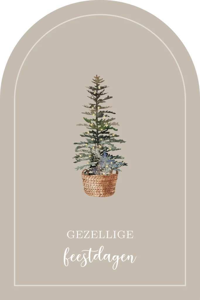 Vrolijk kerstkaartje in originele vorm met schattige tekening van een kerstboom in een mandje. Wens je vrienden en familie een gezellige feestdagen met deze leuke kerstkaart.