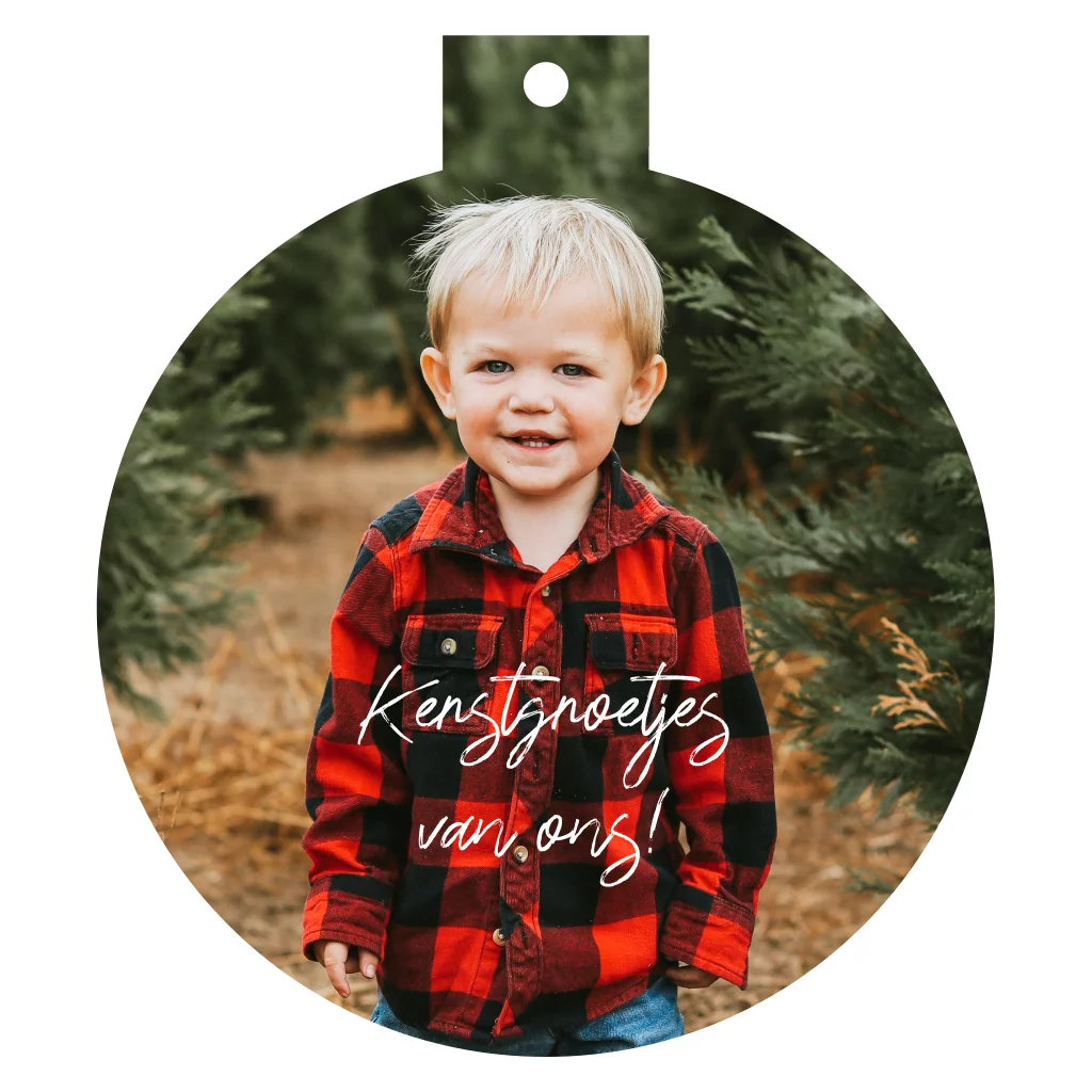 Speciale kerstkaart in de vorm van een kerstbal met persoonlijke foto