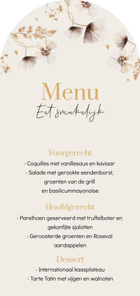 Stijlvolle menukaart in boogvorm met bloemen en beige tinten
