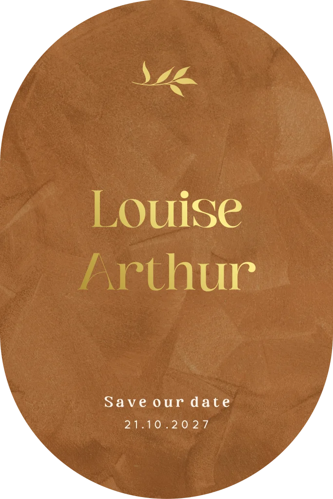 Chique save the date kaart in ovale vorm in warmbruine velvet look. Aan beide zijden staat goudfoliedruk, daardoor krijgt de kaart een luxe uitstraling. Boven de namen staat een subtiel klein takje, pas de kaart naar wens aan met hulp van de online ontwerptool.| Totaalprijs: 0 |
