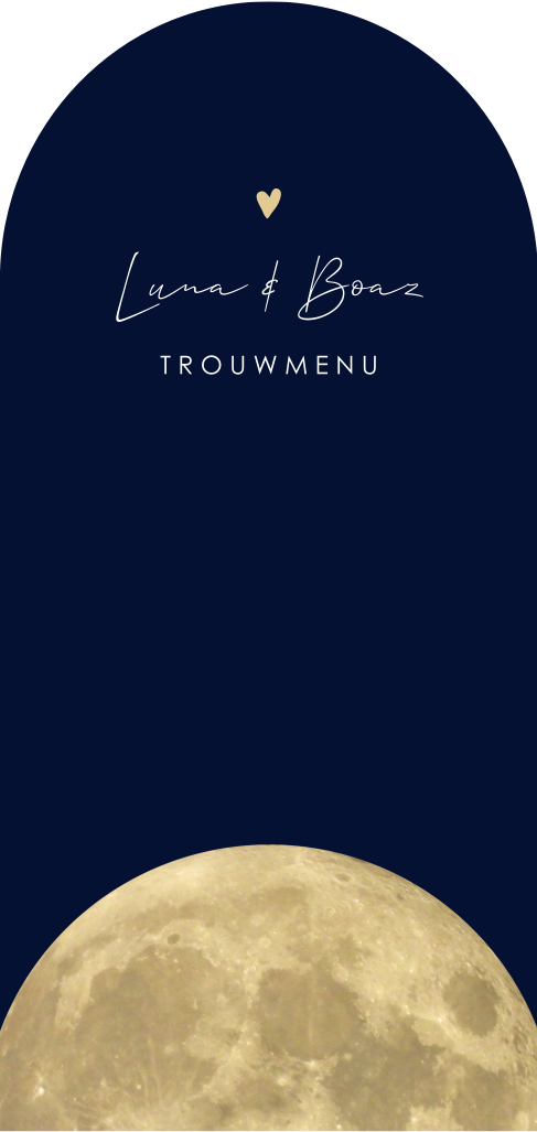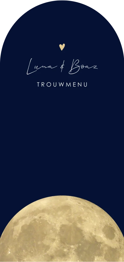 Stijlvolle menukaart passend bij de trouwkaart met maan. De menukaart is in boogvorm, boven de maan staan de namen in sierlijk wit handschrift met een romantisch hartje erboven. Op de achterzijde is ruimte voor de menu tekst, met hartjes tussen de verschillende menugangen, bon appétit!