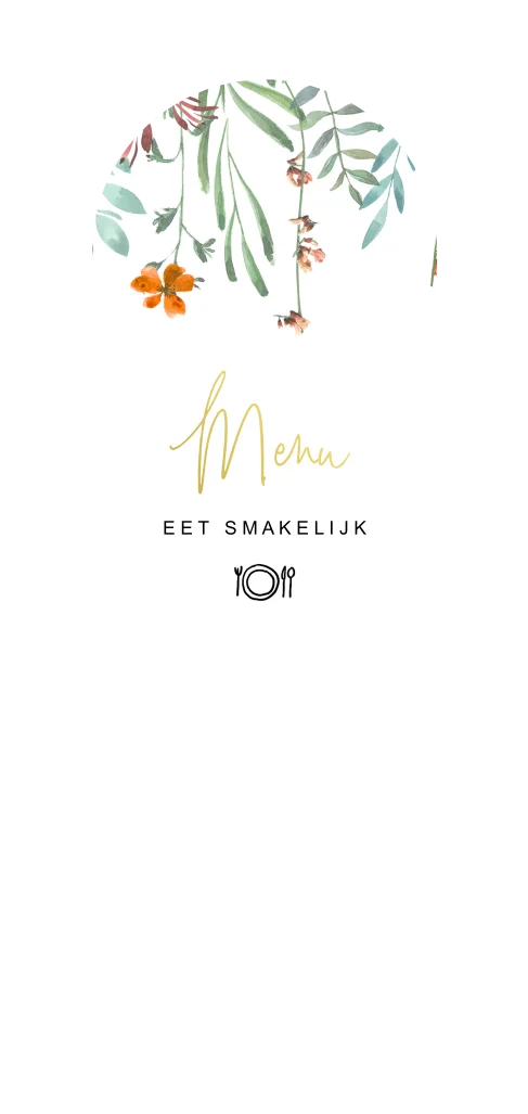 Chic, deze menukaart in boogvorm met het woord 'menu' in goudfolie op de voorkant! Bovenaan een rand van kleurrijke veldbloemen in roze, oranje en groen. Onder de tekst een leuk icoontje van een bordje met bestek. Op de achterzijde staat de inhoud van het menu in verschillende lettertypen in goudgeel en zwart, onderaan komt het design van de veldbloemen weer terug.