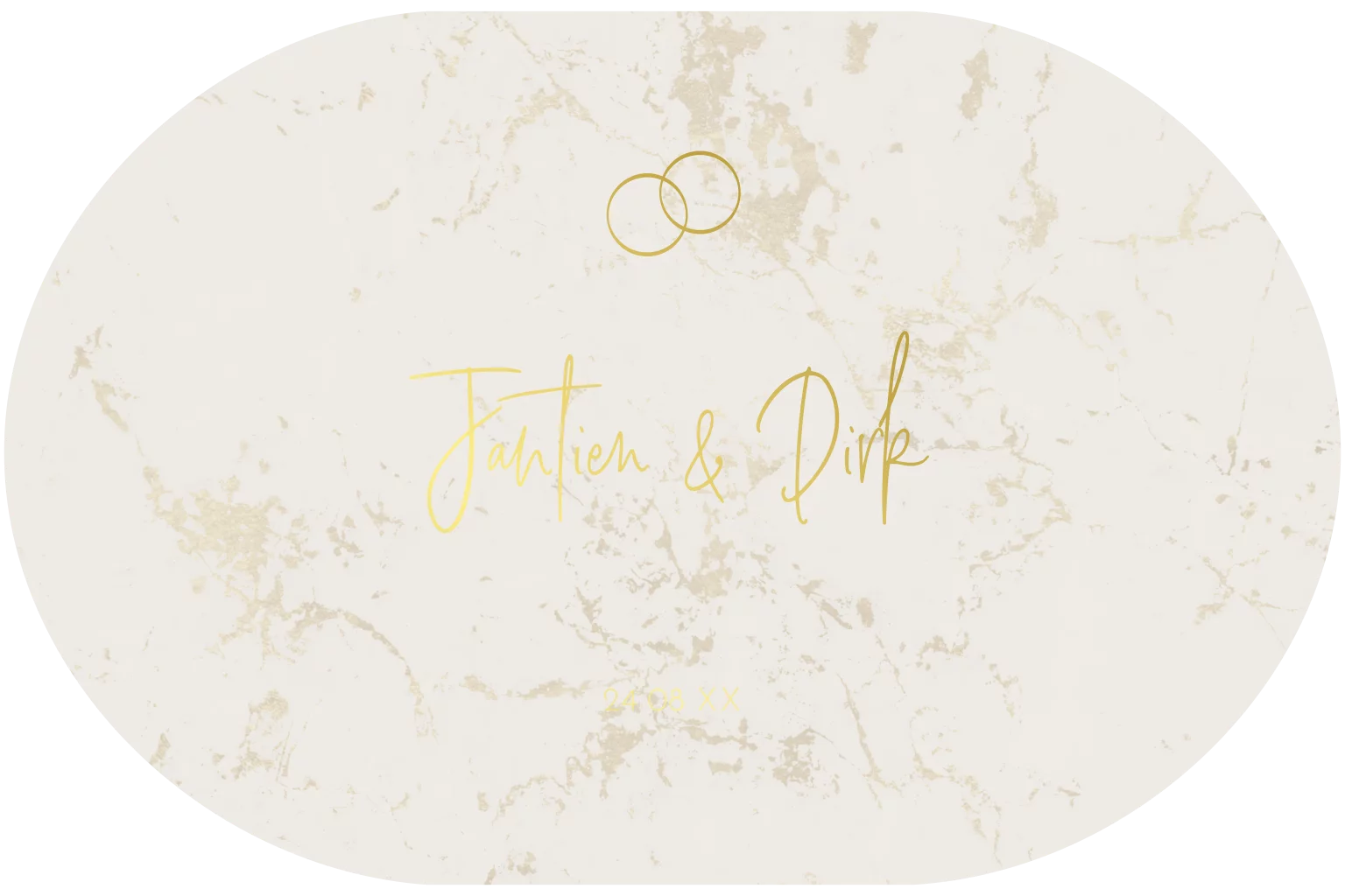 Ovale trouwkaart liggend model in pastelkleurige marmerlook. De tekst staat in goudfoliedruk voor een extra luxe accent. De namen staan in trendy lettertype met trouwringen erboven. Op de witte achterzijde staan leuke icoontjes bij het dagprogramma, pas de kaart naar wens aan in de online editor en bestel een proefdruk.