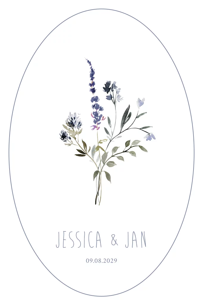 Ovale trouwkaart met een paars boeketje