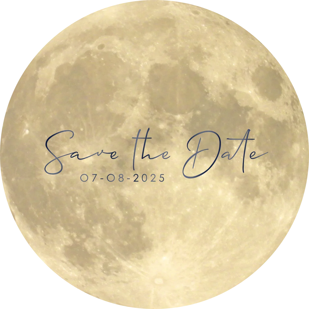 Originele save the date kaart in de vorm van een maan in zachtgeel en beige. De achterkant van deze ronde kaart is wit, de tekst staat in leuke typografie, pas deze eenvoudig zelf aan in de online editor.| Totaalprijs: 0 |