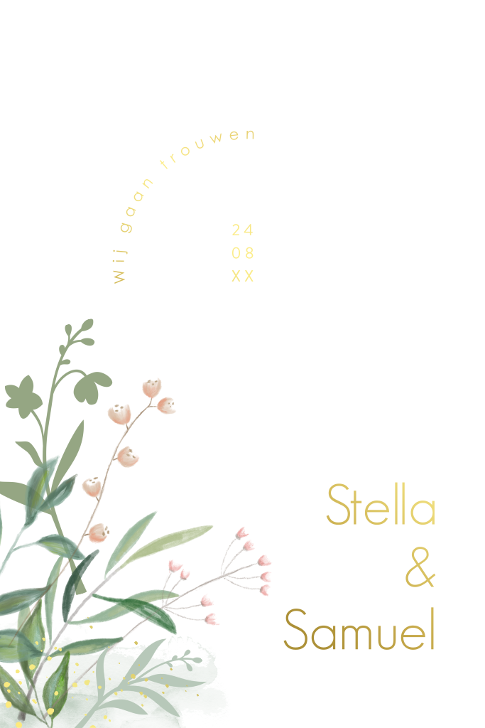 Deze stijlvolle huwelijksuitnodiging heeft waterverf bladeren en bloemetjes met een afgeronde bovenkant, en is perfect voor een bruiloft met een natuurlijke of botanische thema. De trouwkaart in boogvorm met goudfolie is een unieke en stijlvolle uitnodiging voor een onvergetelijke bruiloft.