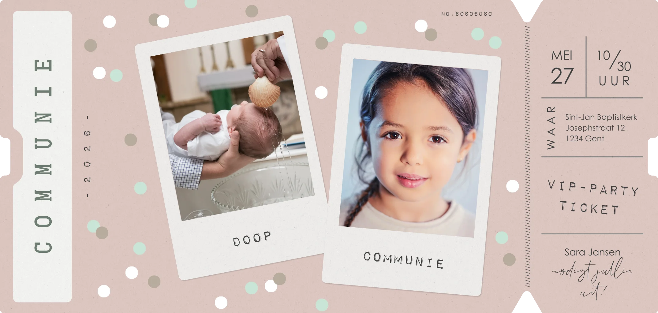 Originele roze communie uitnodiging voor een meisje in de vorm van een ticket. Op de voorkant is ruimte om twee foto's te uploaden, rond de foto staat vrolijke confetti. Pas de kaart naar wens aan in de online editor.