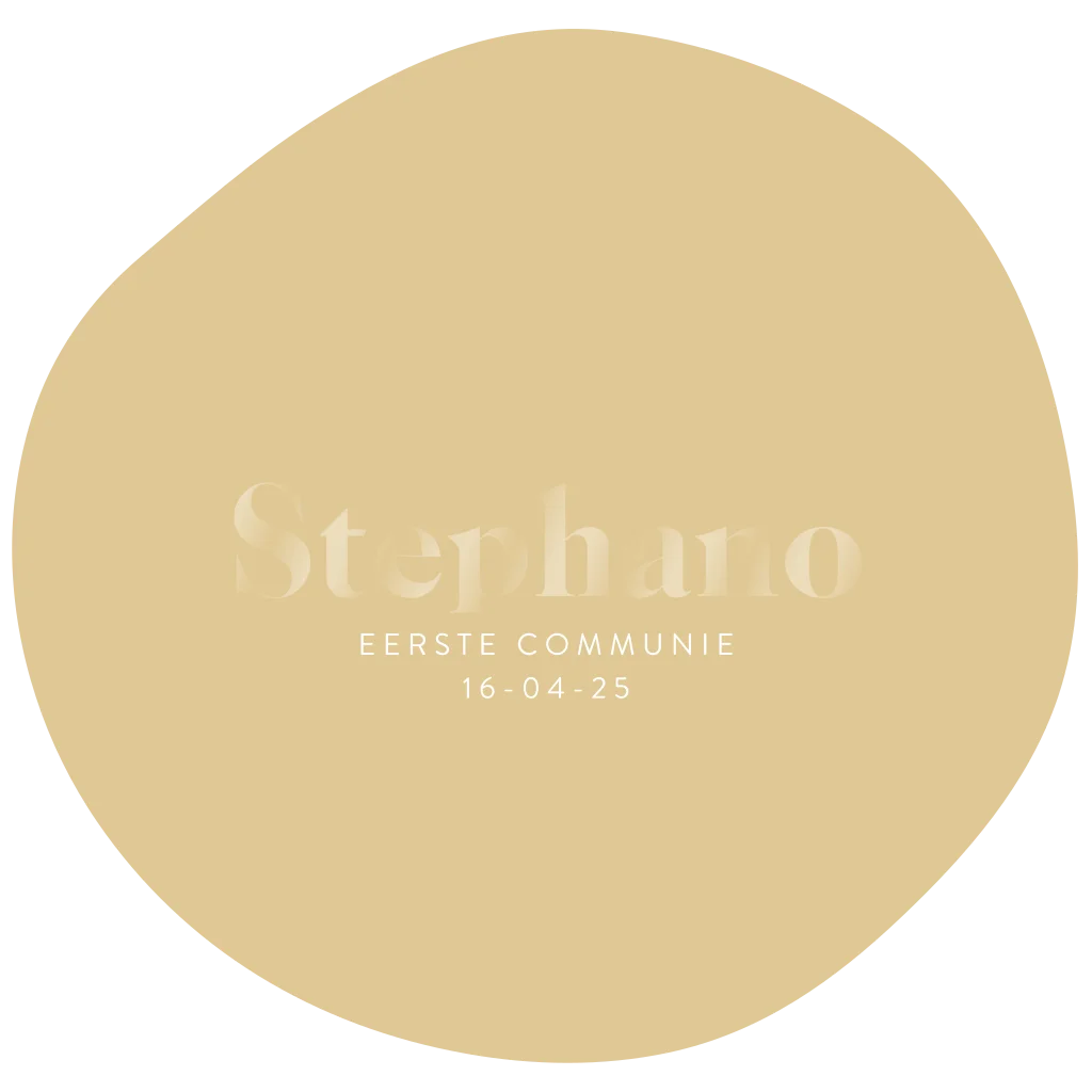 Originele uitnodiging voor de communie van een jongen of meisje in organische vorm. De tekst staat in hoogglans op een zandkleurige achtergrond. De achterkant van de kaart is beige met tekst in zandkleur en zwart, deze pas je naar eigen wens aan in de online editor.