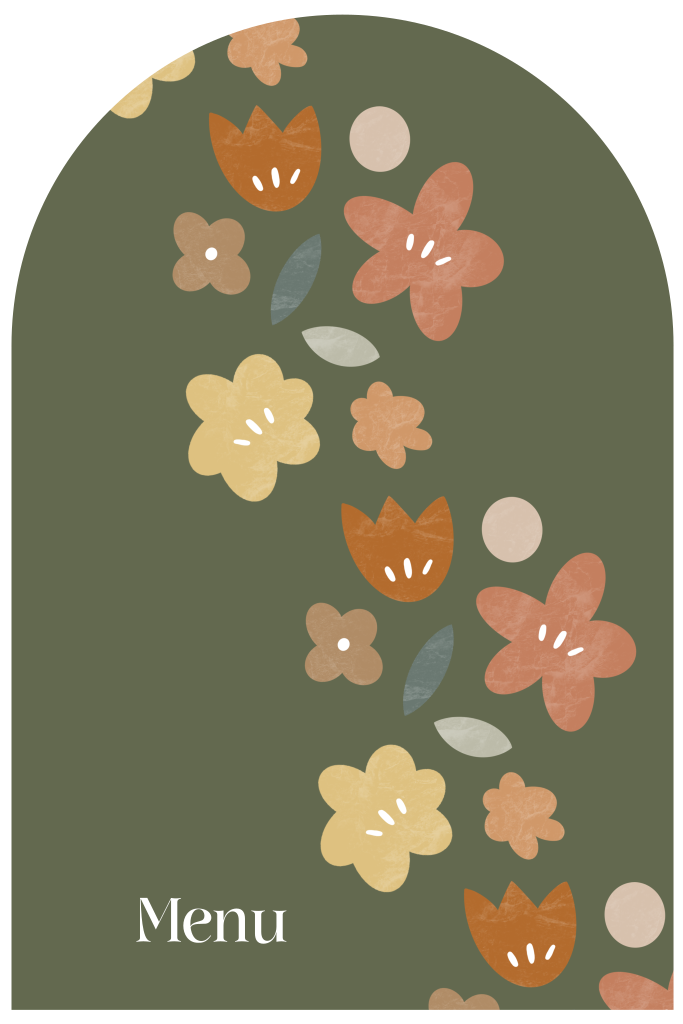 Een vrolijke 21 diner menukaart passend bij de originele uitnodiging. De menukaart is mosgroen met kleurrijke bloemen en blaadjes en is in boogvorm. Op de witte achterkant is ruimte voor het menu en komt het bloemendesign terug langs de rand van de kaart.