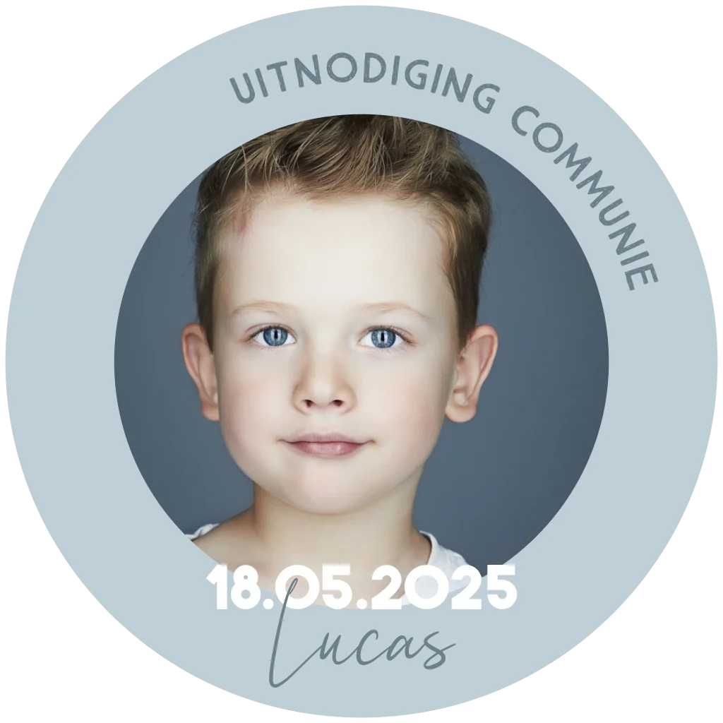 Leuke communiekaart in een bijzondere vorm! De uitnodiging voor een jongen heeft een blauwe achtergrond en ruimte voor een eigen foto.