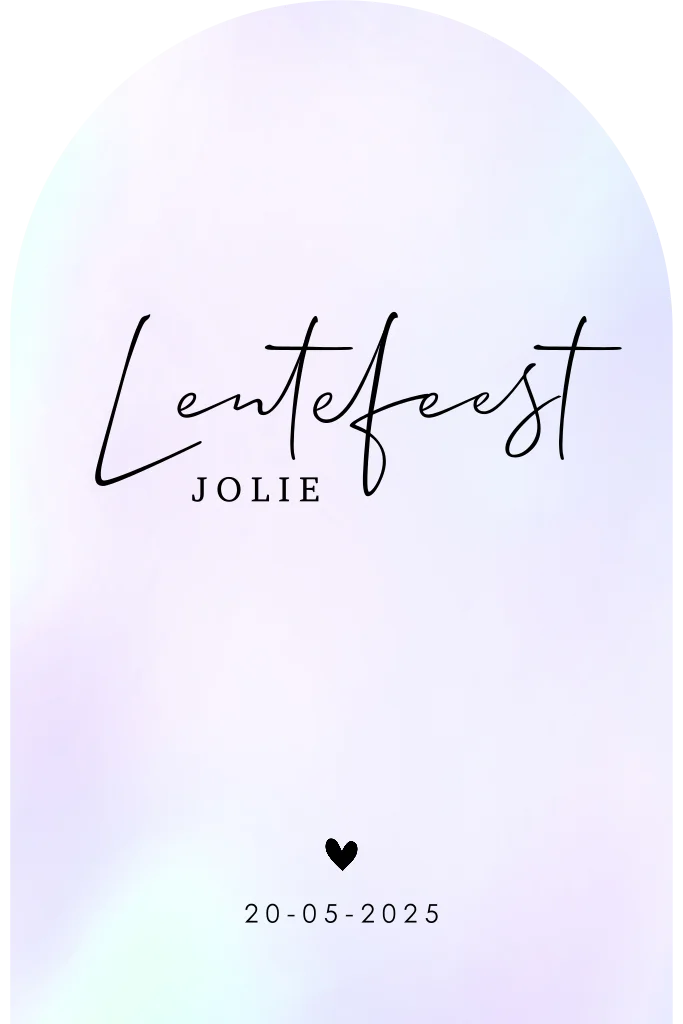 Deze trendy uitnodiging past helemaal bij een lentefeest! De kaart in boogvorm heeft een holografische look. De tekst in modern lettertype komt mooi naar voren op de paars, roze en blauwe kleur en het kleine hartje zorgt voor een lief accent.