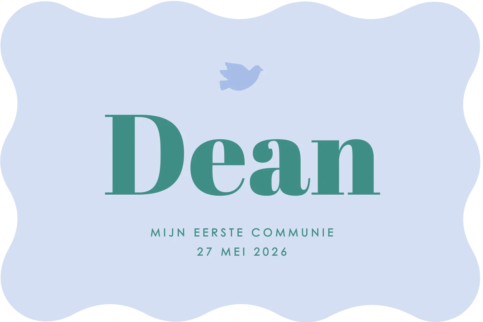 Superhip, deze uitnodiging voor de communie in een bijzondere golfvorm. De voorkant is lavendelblauw met groen, de achterkant groen met blauwe tekst, mooi colourblock! De naam staat in stoere letters met een duif erboven, op de achterzijde is ruimte voor een leuke foto en de tekst van de uitnodiging.