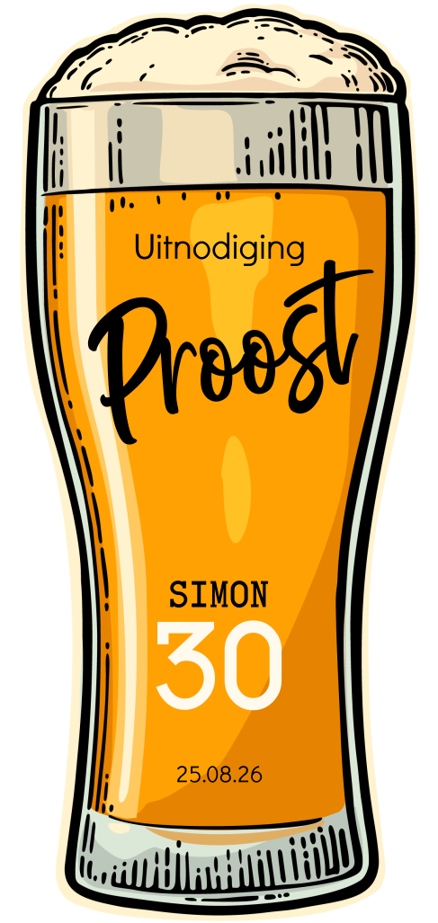 Je wordt dertig, daar moet op gedronken worden! Originele uitnodiging in de vorm van een bierglas in goudgeel. Pas de tekst naar wens aan in de online editor.