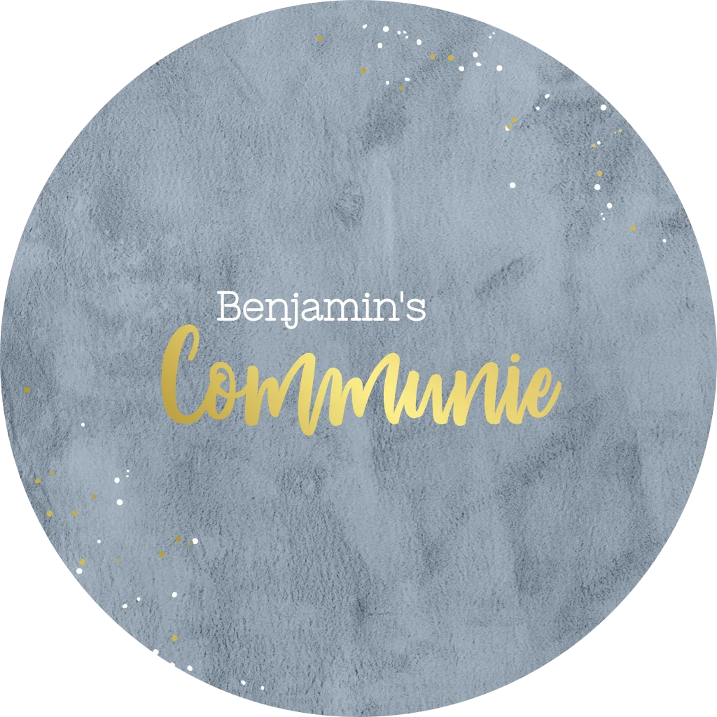 Hippe communiekaart in ronde vorm met goudfolie tekst op een blauwe velvet-look achtergrond.