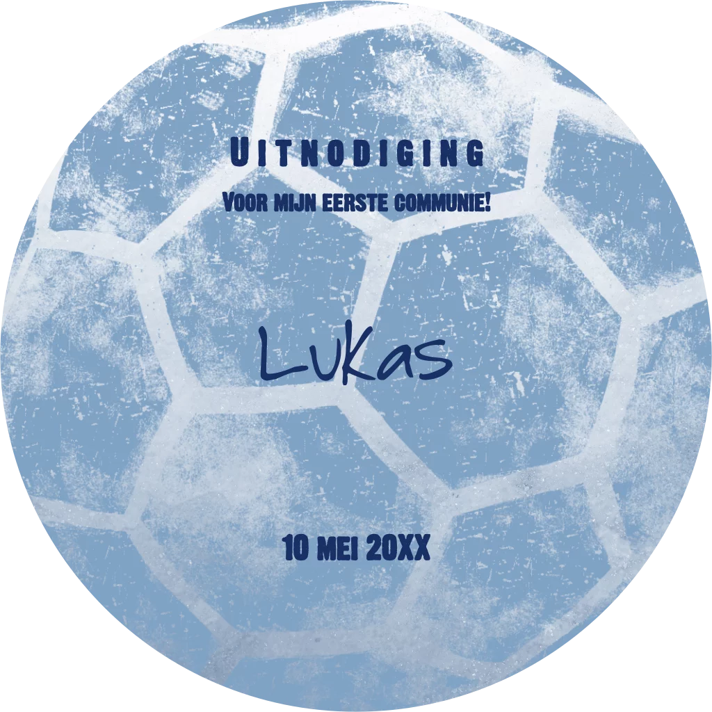 Een hippe en stoere uitnodiging voor een communie feest of vormsel met een print van een voetbal erop. Bewerk deze ronde uitnodiging eenvoudig door de teksten en kleuren aan te passen.