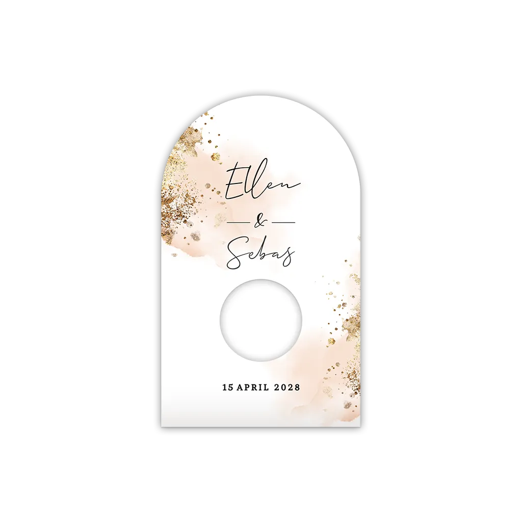 Boogkaartje als verpakking van de gastgeschenkjes. Dit kaartje is in de stijl van de watercolor trouwkaart in roze en goudlook.
