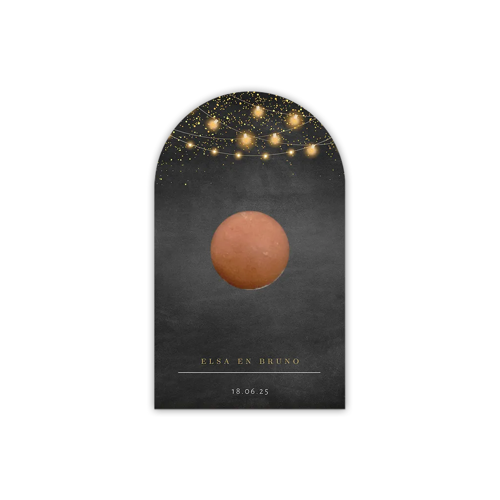 Stoer kaartje in boogvorm als verpakking voor gastgeschenkjes in stijl van de trouwkaart met krijtbord achtergrond en lampenslinger.