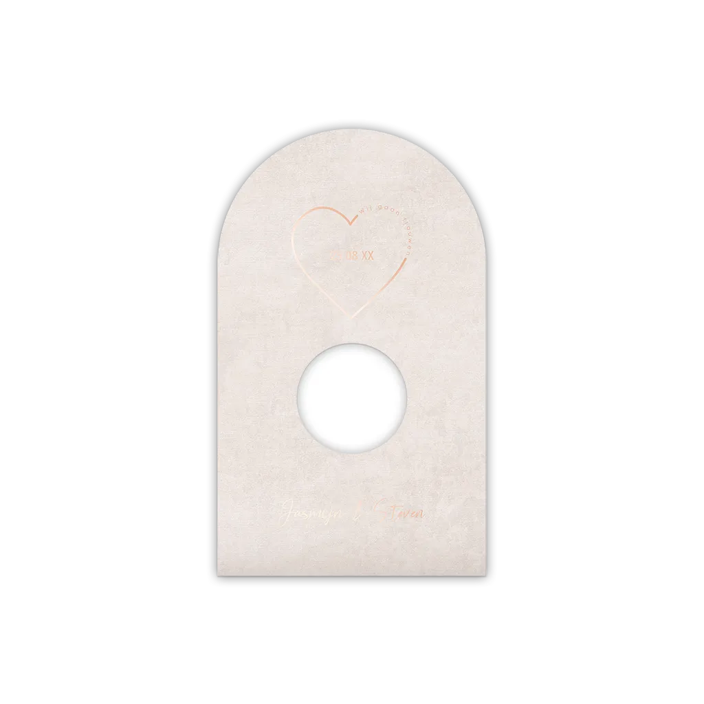 Kaartje in boogvorm als geschenkverpakking, past perfect bij de langwerpige trouwkaart met het roségoudfolie hart.