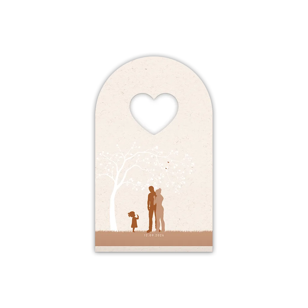 Geschenkverpakking in boogvorm in stijl van de trouwkaart met silhouet van gezin en boom in terracotta.