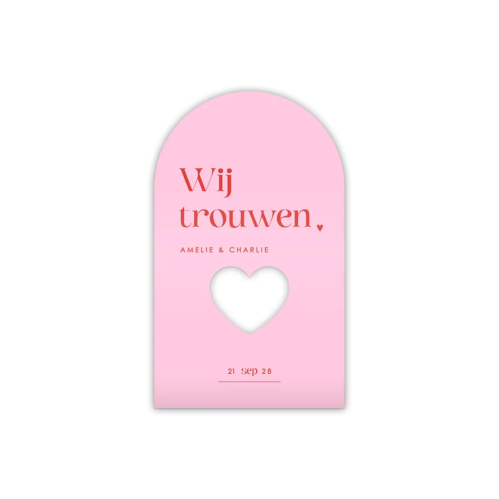Leuk kaartje als verpakking van gastgeschenkjes, in stijl van de roze met rood colourblock trouwkaart.