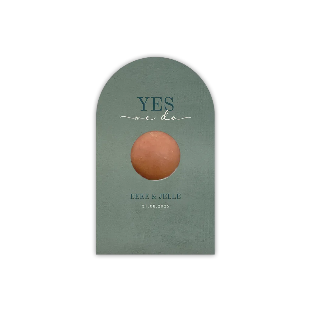 Een boogkaartje in stijl van de groene trouwkaart, hiermee kun je de bedankjes voor jullie bruiloftsgasten verpakken.