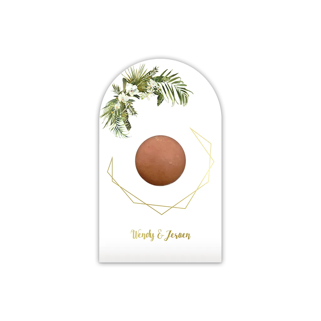 Boogkaartje met hetzelfde ontwerp als de stijlvolle trouwkaart met orchidee, verras de gasten van jullie bruiloft met een originele attentie verpakt in dit unieke kaartje.