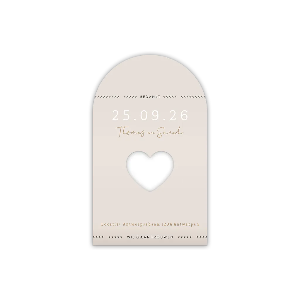 Boogkaartje in pastelroze met hart bij de trouwkaart in ticketstijl
