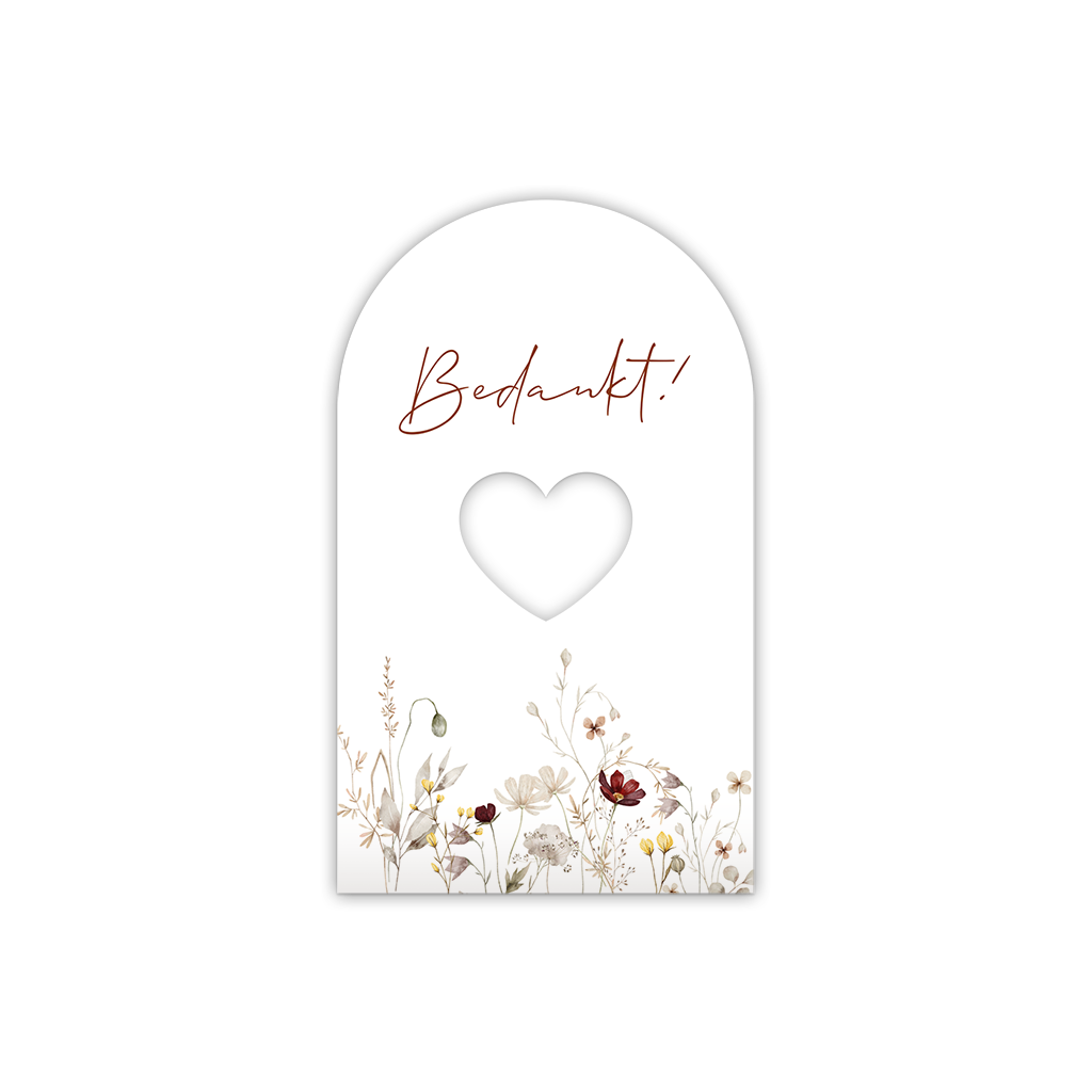 Mooi boogkaartje met onderaan een rand van veldbloemen in zachte kleuren, mooie verpakking in stijl van de trouwkaart!